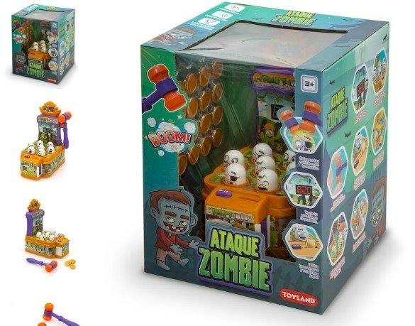 Nombre: Ataque Zombie - Incluye: 1 base zombie con marcador de puntaje, 2 martillos, 16 fichas - Medida del producto: 22 x 21 x 27,8 cm. - Tipo de Embalaje: Caja - Pilas: 2 pilas AA (No incluidas) - Material: Plastico - Edad minima recomendada: +3 Años - Cantidad de jugadores: 2 jugadores