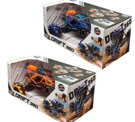 Nombre: Drift 360 - Incluye: 1 Auto 1:16, 1 Control Inalámbrico, 1 reloj control, 1 cable USB, 1 bateria de litio 3.7V, 3 pilas CR2032, 1 destornillador - Medida del producto: 28 cm largo x 17 cm ancho x 17 cm alto - Medida del Embalaje: 36 cm largo x 17,5 cm ancho x 18,5 cm alto - Tipo de Embalaje: Caja Visora - Pilas vehiculo: Bateria Li-Ion 3.7v 1200mAh recargable (incluida) - Pilas Control: control: 2 pilas AA (no incluidas) Sensor de gravedad (reloj): 3 pilas CR2032 (incluidas) - Frecuancia: 2.4 Ghz - Alcance: 20-30 metros - Material: Plastico - Edad minima recomendada: +6 años