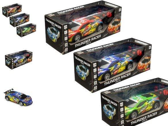 Nombre: Thunder - Incluye: 1 Auto 1:16, 1 Control Inalámbrico, 1 cable USB, 1 bateria de litio 3.7V, 1 destornillador - Medida del producto: 23 cm largo x 9,5 cm ancho x 6,5 cm alto - Medida del Embalaje: 31,5 cm largo x 12 cm ancho x 12 cm alto - Tipo de Embalaje: Caja Visora - Pilas vehiculo: Bateria Li-ion 3.7V 500mAh recargable (Incluida) - Pilas Control: 2 pilas AA (no incluidas) - Material: Plastico - Frecuencia: 27 Mhz - Alcance: 10-15 metros - Edad minima recomendada: +6 años